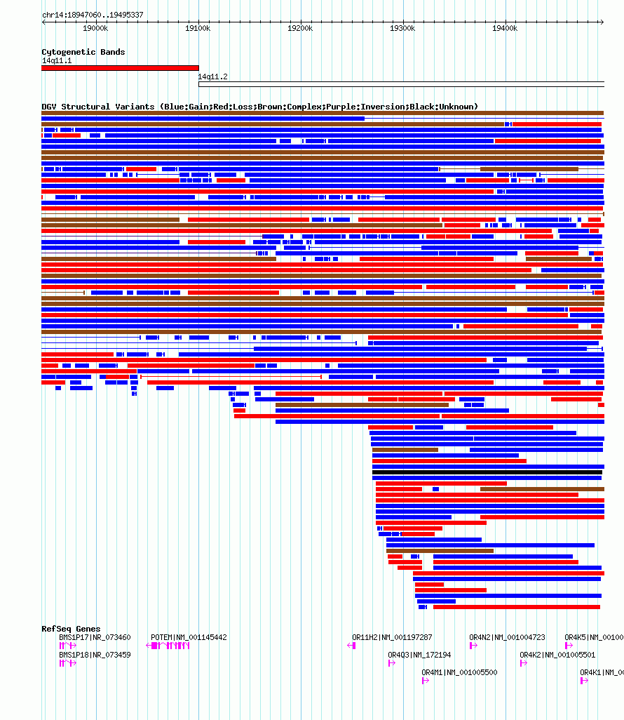 Variant DetailsVariant: nsv1037731| Internal ID | 19126950 | | Landmark | | | Location Information | | | Cytoband | 14q11.1 | | Allele length | | Assembly | Allele length | | hg38 | 667992 | | hg19 | 548438 | | hg18 | 548278 |