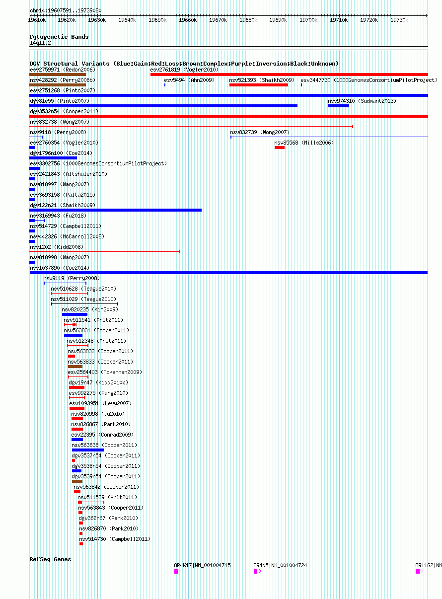 Variant DetailsVariant: nsv1037890| Internal ID | 19127109 | | Landmark | | | Location Information | | | Cytoband | 14q11.2 | | Allele length | | Assembly | Allele length | | hg38 | 131490 | | hg19 | 131490 | | hg18 | 131490 |