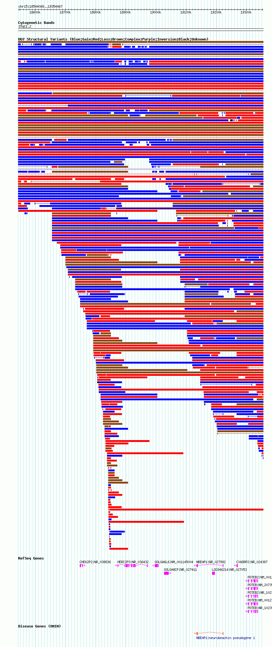 Variant DetailsVariant: nsv1038082| Internal ID | 19127301 | | Landmark | | | Location Information | | | Cytoband | 15q11.1 | | Allele length | | Assembly | Allele length | | hg38 | 805673 | | hg19 | 805749 | | hg18 | 810400 |