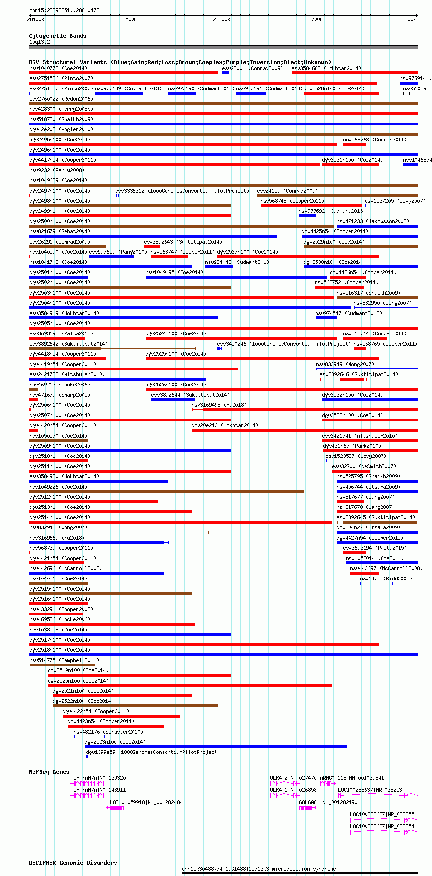 Variant DetailsVariant: nsv1038434| Internal ID | 19127653 | | Landmark | | | Location Information | | | Cytoband | 15q13.2 | | Allele length | | Assembly | Allele length | | hg38 | 417623 | | hg19 | 417623 | | hg18 | 417623 |