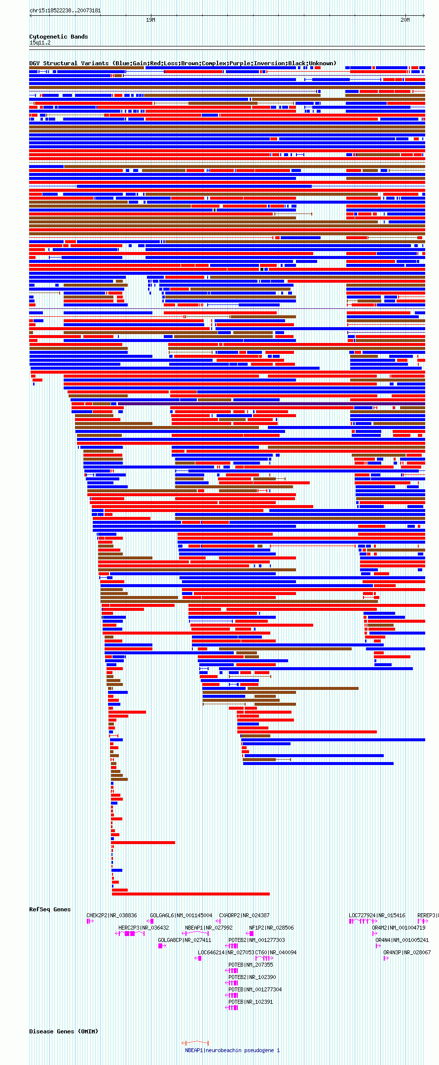 Variant DetailsVariant: nsv1038756| Internal ID | 19127975 | | Landmark | | | Location Information | | | Cytoband | 15q11.1 | | Allele length | | Assembly | Allele length | | hg38 | 2226896 | | hg19 | 2309594 | | hg18 | 1550944 |