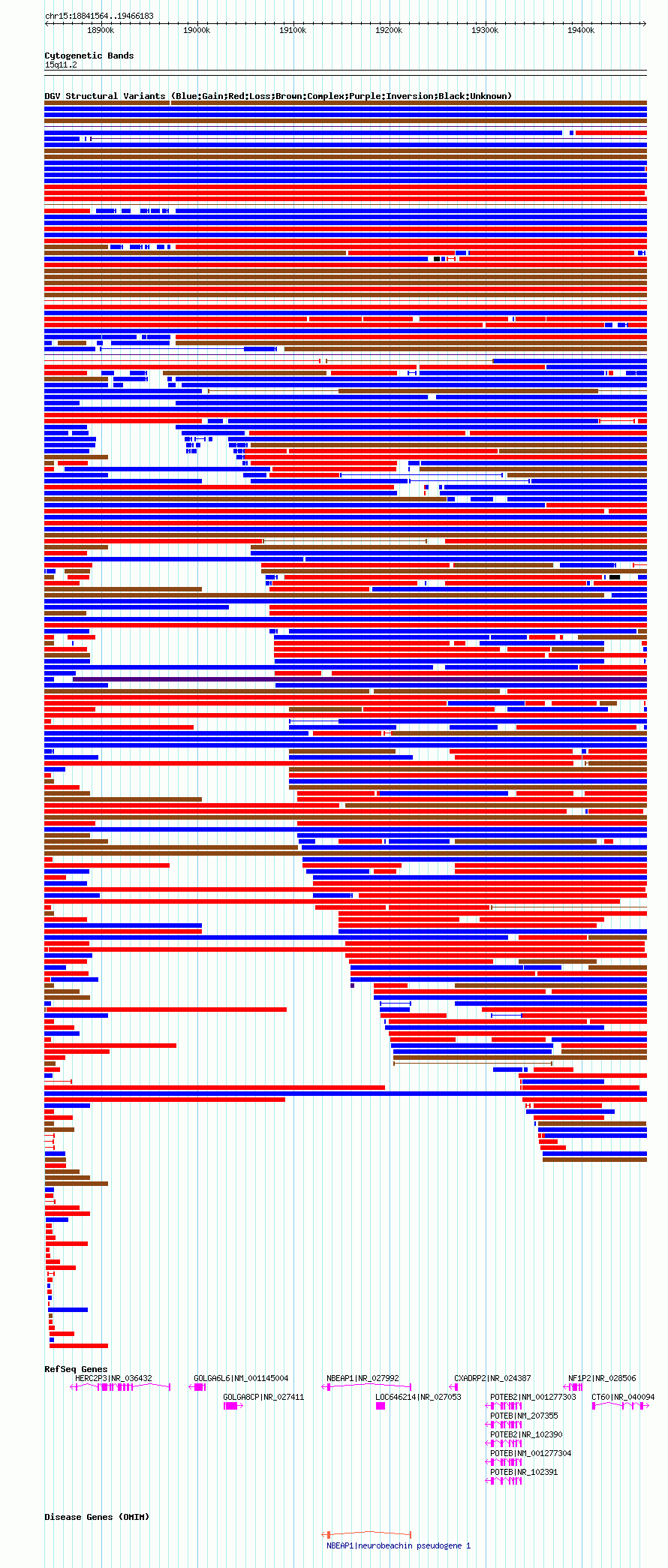 Variant DetailsVariant: nsv1038868| Internal ID | 19128087 | | Landmark | | | Location Information | | | Cytoband | 15q11.1 | | Allele length | | Assembly | Allele length | | hg38 | 619899 | | hg19 | 619975 | | hg18 | 624620 |
