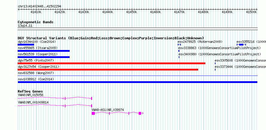 Variant DetailsVariant: nsv1038912| Internal ID | 19128131 | | Landmark | | | Location Information | | | Cytoband | 13q14.11 | | Allele length | | Assembly | Allele length | | hg38 | 99847 | | hg19 | 99847 | | hg18 | 99847 |