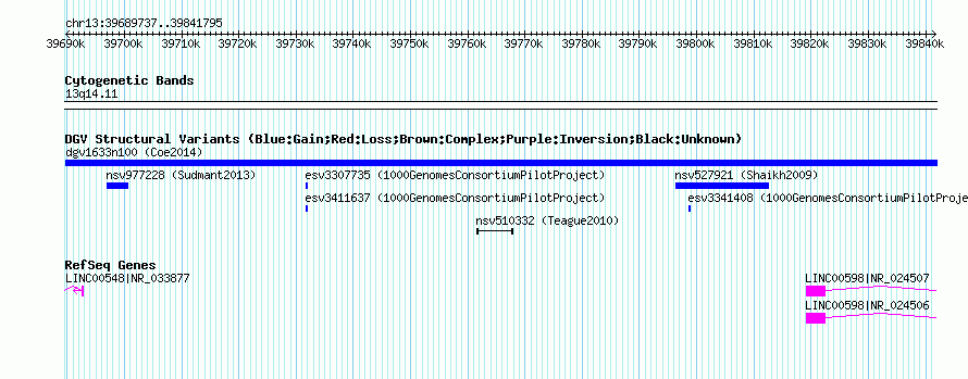 Variant DetailsVariant: nsv1039012| Internal ID | 18781543 | | Landmark | | | Location Information | | | Cytoband | 13q14.11 | | Allele length | | Assembly | Allele length | | hg38 | 152059 | | hg19 | 152059 | | hg18 | 152059 |