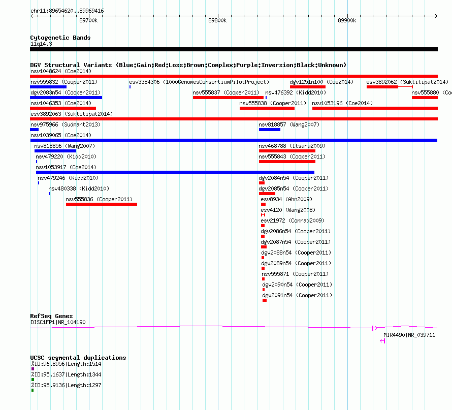 | Variant Type | CNV gain | Copy Number | | Allele State | | Allele Origin | | Probe Count | | Validation Flag | | Merged Status | M | Merged Variants | | Supporting Variants | nssv3507014 | Samples | | Known Genes | DISC1FP1, MIR4490 | Method | SNP array | Analysis | Affymetrix SNP array copy number analysis | Platform | Affymetrix SNP Array 6.0 | Comments | | Reference | Coe_et_al_2014 | Pubmed ID | 25217958 | Accession Number(s) | nsv1039065