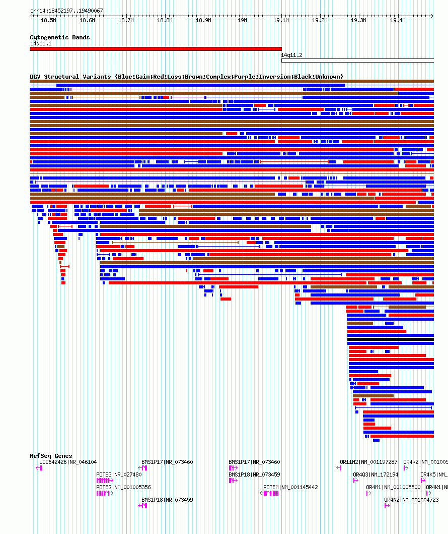 Variant DetailsVariant: nsv1039070| Internal ID | 19128289 | | Landmark | | | Location Information | | | Cytoband | 14q11.1 | | Allele length | | Assembly | Allele length | | hg38 | 1346349 | | hg19 | 1038031 | | hg18 | 1037871 |