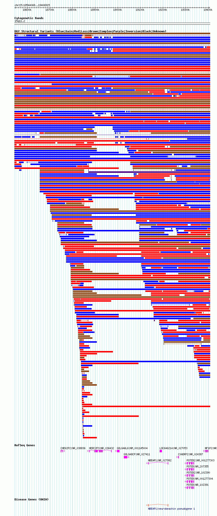 | | Variant Type | CNV gain+loss | | Copy Number | | | Allele State | | | Allele Origin | | | Probe Count | | | Validation Flag | | | Merged Status | M | | Merged Variants | dgv2189n100 | | Supporting Variants | nssv3536555, nssv3715984 | | Samples | | | Known Genes | CHEK2P2, CXADRP2, GOLGA6L6, GOLGA8CP, HERC2P3, LOC646214, NBEAP1, NF1P2, POTEB, POTEB2 | | Method | SNP array | | Analysis | Affymetrix SNP array copy number analysis | | Platform | Affymetrix SNP Array 6.0 | | Comments | | | Reference | Coe_et_al_2014 | | Pubmed ID | 25217958 | | Accession Number(s) | nsv1039193