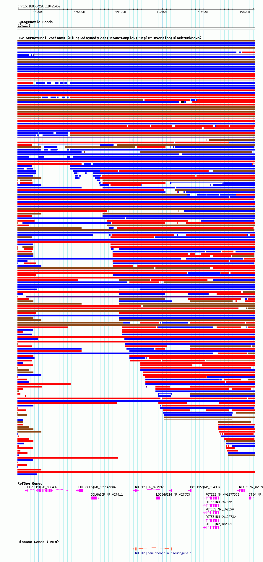 Variant DetailsVariant: nsv1039316| Internal ID | 19128535 | | Landmark | | | Location Information | | | Cytoband | 15q11.1 | | Allele length | | Assembly | Allele length | | hg38 | 567703 | | hg19 | 567779 | | hg18 | 572424 |