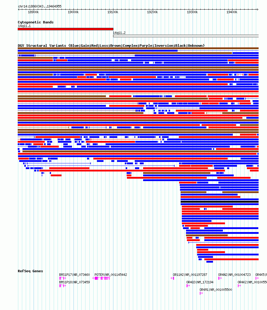 Variant DetailsVariant: nsv1039409| Internal ID | 19128628 | | Landmark | | | Location Information | | | Cytoband | 14q11.1 | | Allele length | | Assembly | Allele length | | hg38 | 696008 | | hg19 | 604773 | | hg18 | 604613 |