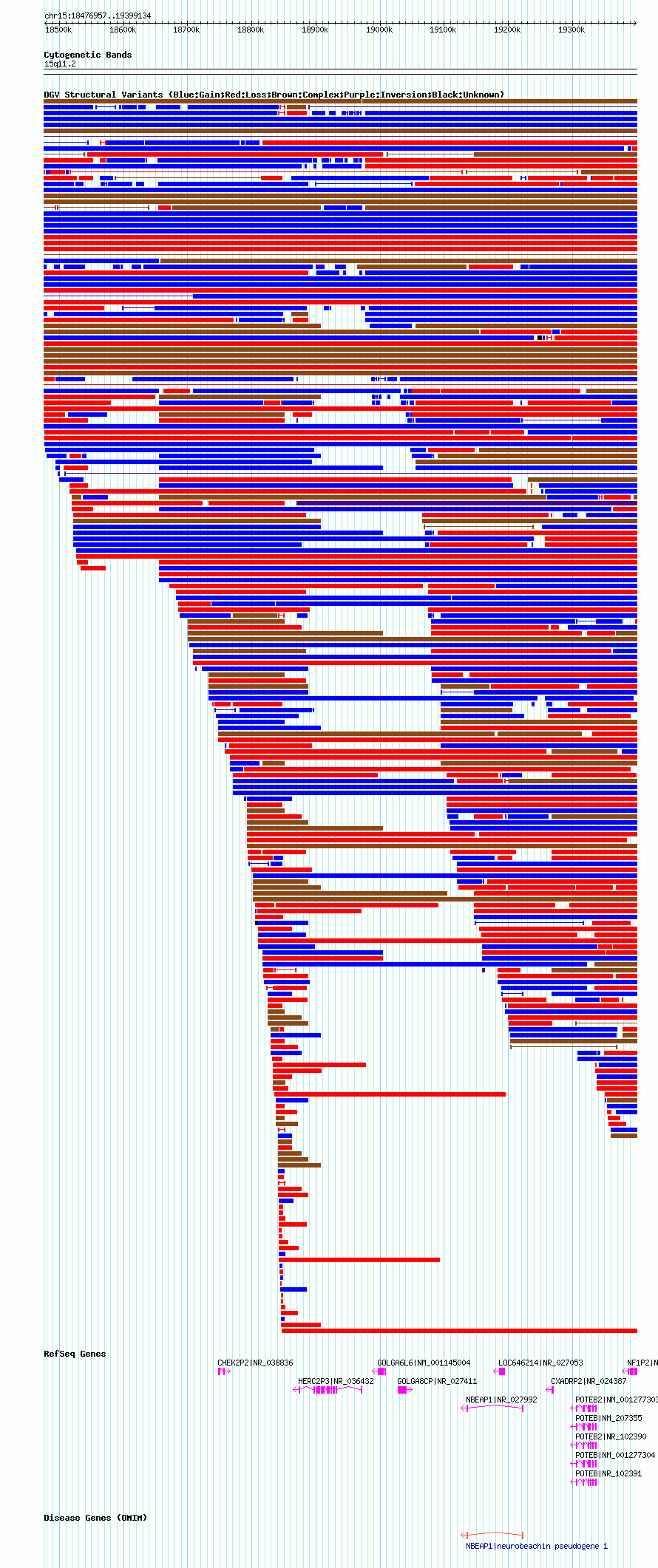| | Variant Type | CNV gain+loss | | Copy Number | | | Allele State | | | Allele Origin | | | Probe Count | | | Validation Flag | | | Merged Status | M | | Merged Variants | dgv2189n100 | | Supporting Variants | nssv3715765, nssv3715764 | | Samples | | | Known Genes | CHEK2P2, CXADRP2, GOLGA6L6, GOLGA8CP, HERC2P3, LOC646214, NBEAP1, NF1P2, POTEB, POTEB2 | | Method | SNP array | | Analysis | Affymetrix SNP array copy number analysis | | Platform | Affymetrix SNP Array 6.0 | | Comments | | | Reference | Coe_et_al_2014 | | Pubmed ID | 25217958 | | Accession Number(s) | nsv1039565