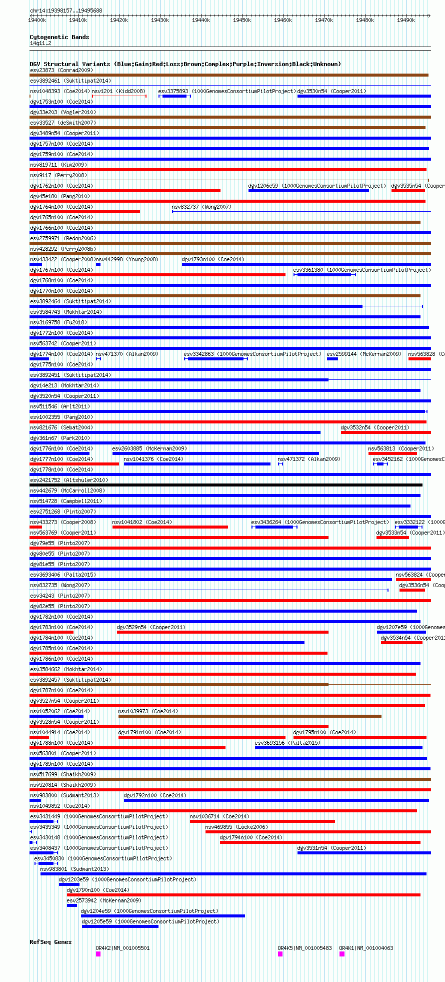 Variant DetailsVariant: nsv1039616| Internal ID | 19128835 | | Landmark | | | Location Information | | | Cytoband | 14q11.2 | | Allele length | | Assembly | Allele length | | hg38 | 97532 | | hg19 | 97532 | | hg18 | 97532 |