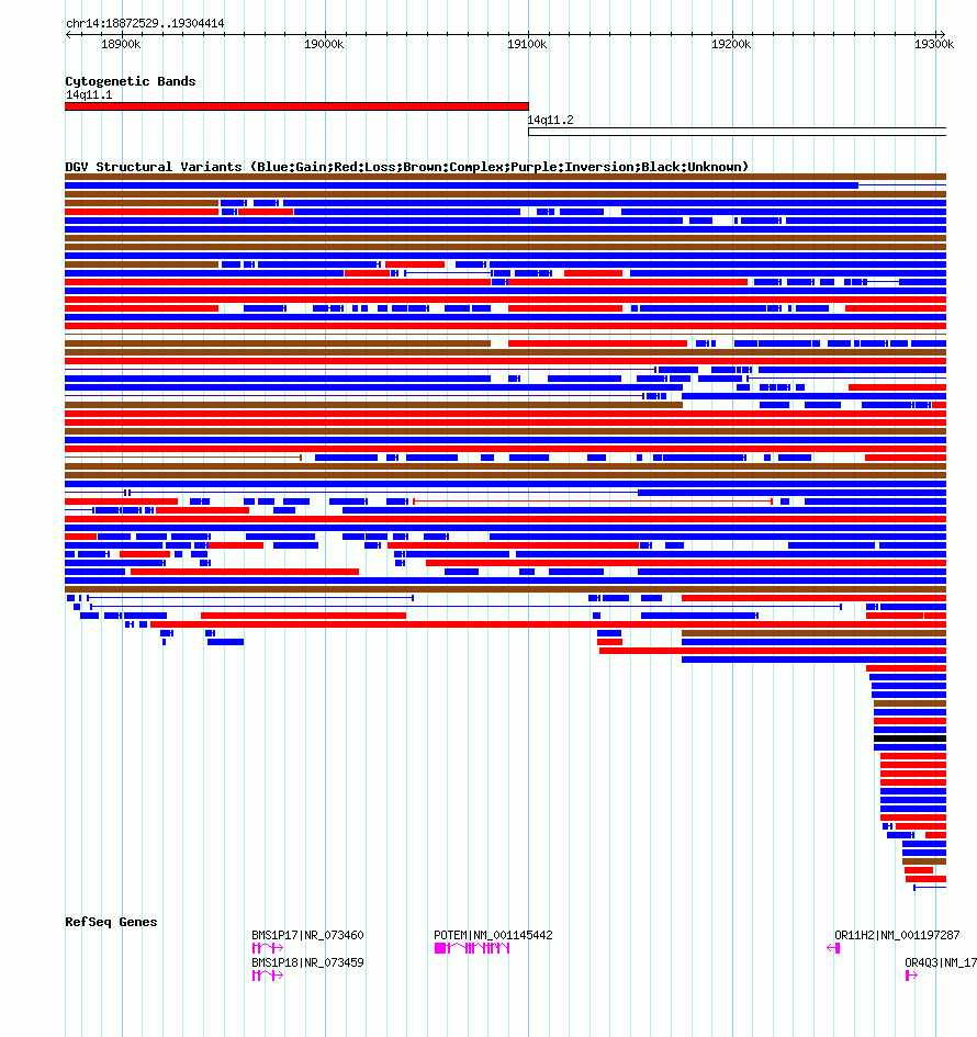 Variant DetailsVariant: nsv1039993| Internal ID | 19129212 | | Landmark | | | Location Information | | | Cytoband | 14q11.1 | | Allele length | | Assembly | Allele length | | hg38 | 535467 | | hg19 | 432046 | | hg18 | 431886 |
