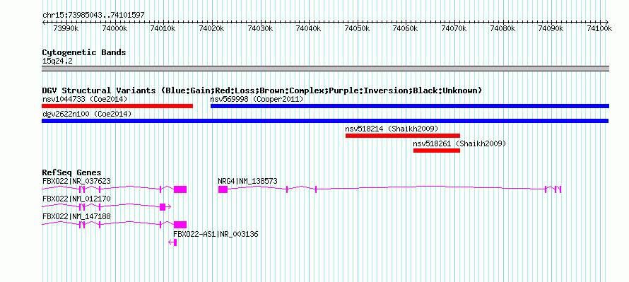 | | Variant Type | CNV gain | | Copy Number | | | Allele State | | | Allele Origin | | | Probe Count | | | Validation Flag | | | Merged Status | M | | Merged Variants | dgv2622n100 | | Supporting Variants | nssv3553701 | | Samples | | | Known Genes | FBXO22, FBXO22-AS1, NRG4 | | Method | SNP array | | Analysis | Affymetrix SNP array copy number analysis | | Platform | Affymetrix SNP Array 6.0 | | Comments | | | Reference | Coe_et_al_2014 | | Pubmed ID | 25217958 | | Accession Number(s) | nsv1040053