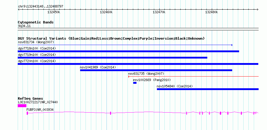 | | Variant Type | CNV gain | | Copy Number | | | Allele State | | | Allele Origin | | | Probe Count | | | Validation Flag | | | Merged Status | M | | Merged Variants | dgv7720n100 | | Supporting Variants | nssv3759836, nssv3759837 | | Samples | | | Known Genes | FUBP3, LOC100272217 | | Method | SNP array | | Analysis | Affymetrix SNP array copy number analysis | | Platform | Affymetrix SNP Array 6.0 | | Comments | | | Reference | Coe_et_al_2014 | | Pubmed ID | 25217958 | | Accession Number(s) | nsv1040196