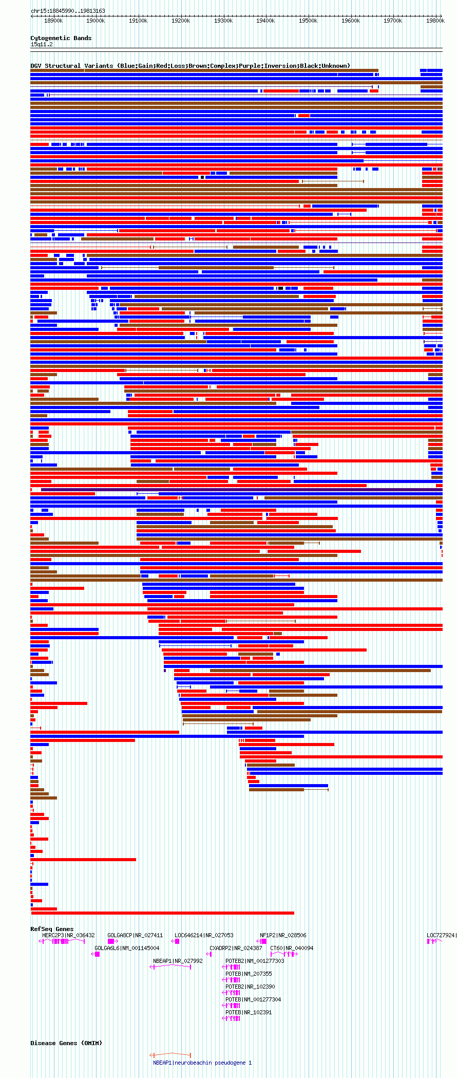| | Variant Type | CNV gain+loss | | Copy Number | | | Allele State | | | Allele Origin | | | Probe Count | | | Validation Flag | | | Merged Status | M | | Merged Variants | dgv2250n100 | | Supporting Variants | nssv3714668, nssv3537348, nssv3537349, nssv3537351, nssv3537350 | | Samples | | | Known Genes | CT60, CXADRP2, GOLGA6L6, GOLGA8CP, HERC2P3, LOC646214, LOC727924, NBEAP1, NF1P2, POTEB, POTEB2 | | Method | SNP array | | Analysis | Affymetrix SNP array copy number analysis | | Platform | Affymetrix SNP Array 6.0 | | Comments | | | Reference | Coe_et_al_2014 | | Pubmed ID | 25217958 | | Accession Number(s) | nsv1040298