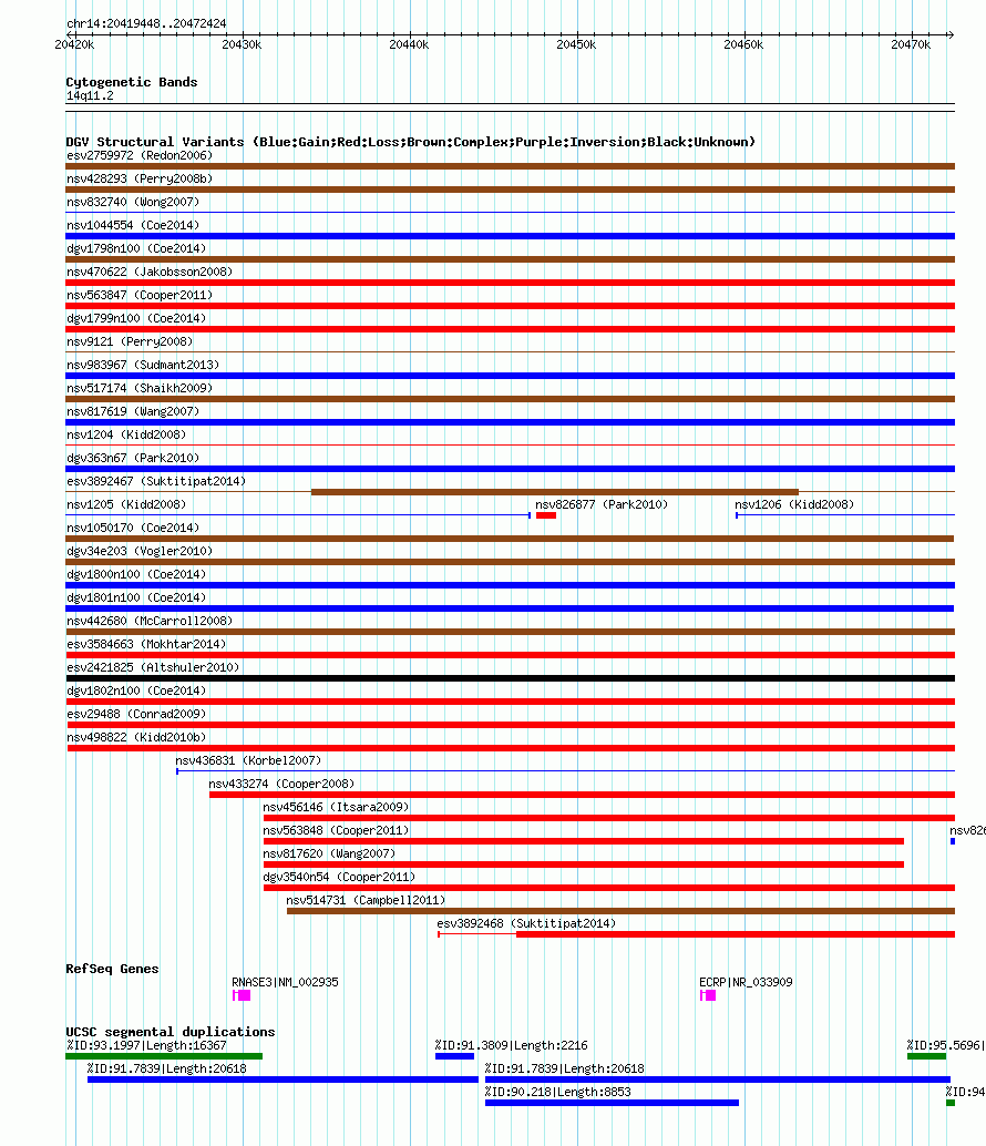 | Variant Type | CNV gain | Copy Number | | Allele State | | Allele Origin | | Probe Count | | Validation Flag | | Merged Status | M | Merged Variants | dgv1801n100 | Supporting Variants | nssv3530752 | Samples | | Known Genes | ECRP, RNASE3 | Method | SNP array | Analysis | Affymetrix SNP array copy number analysis | Platform | Affymetrix SNP Array 6.0 | Comments | | Reference | Coe_et_al_2014 | Pubmed ID | 25217958 | Accession Number(s) | nsv1040447