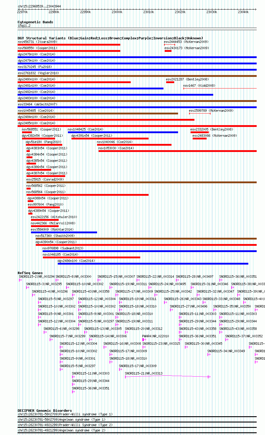 | | Variant Type | CNV gain+loss | | Copy Number | | | Allele State | | | Allele Origin | | | Probe Count | | | Validation Flag | | | Merged Status | M | | Merged Variants | dgv2483n100 | | Supporting Variants | nssv3545566, nssv3545568, nssv3545567 | | Samples | | | Known Genes | PWAR4, SNORD115-10, SNORD115-11, SNORD115-12, SNORD115-13, SNORD115-14, SNORD115-15, SNORD115-16, SNORD115-17, SNORD115-18, SNORD115-19, SNORD115-2, SNORD115-20, SNORD115-21, SNORD115-22, SNORD115-23, SNORD115-24, SNORD115-25, SNORD115-26, SNORD115-27, SNORD115-28, SNORD115-29, SNORD115-3, SNORD115-30, SNORD115-31, SNORD115-32, SNORD115-33, SNORD115-34, SNORD115-35, SNORD115-36, SNORD115-37, SNORD115-38, SNORD115-39, SNORD115-4, SNORD115-40, SNORD115-41, SNORD115-42, SNORD115-43, SNORD115-5, SNORD115-6, SNORD115-7, SNORD115-8, SNORD115-9 | | Method | SNP array | | Analysis | Affymetrix SNP array copy number analysis | | Platform | Affymetrix SNP Array 6.0 | | Comments | | | Reference | Coe_et_al_2014 | | Pubmed ID | 25217958 | | Accession Number(s) | nsv1040603