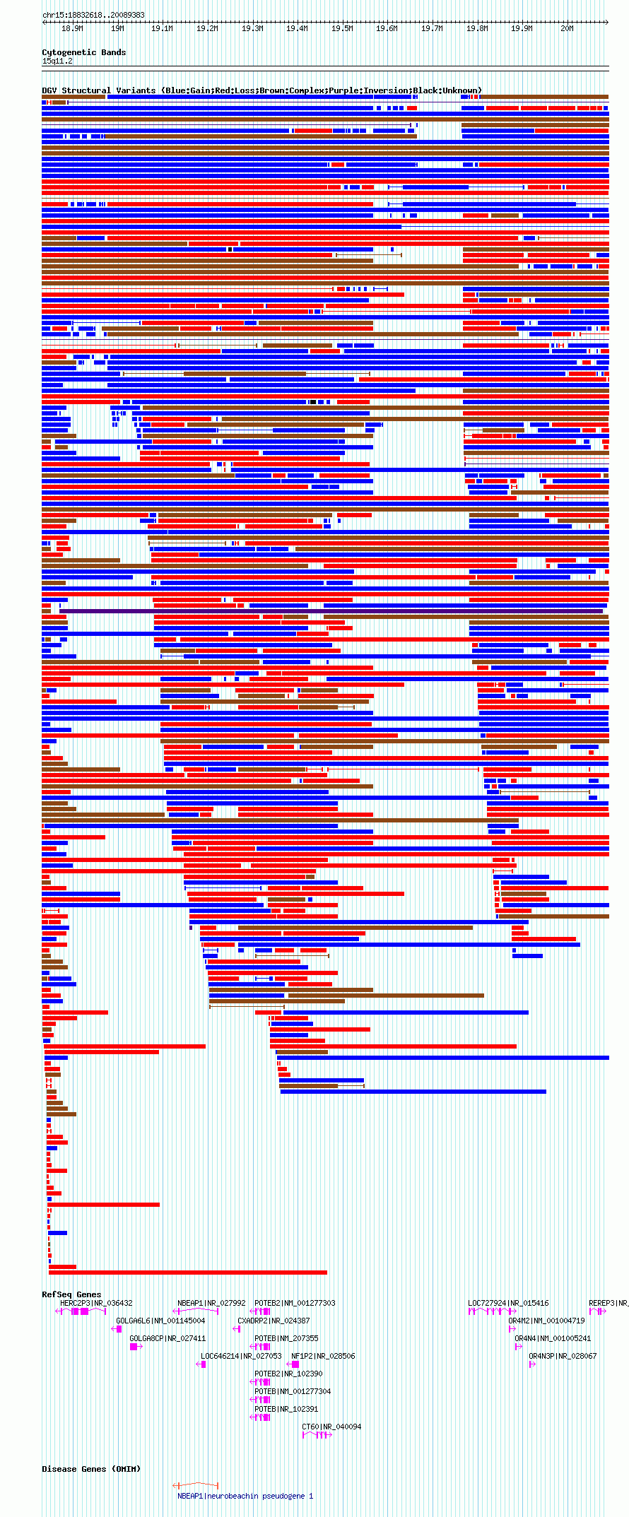 Variant DetailsVariant: nsv1040700| Internal ID | 19129919 | | Landmark | | | Location Information | | | Cytoband | 15q11.1 | | Allele length | | Assembly | Allele length | | hg38 | 1932718 | | hg19 | 2015416 | | hg18 | 1256766 |