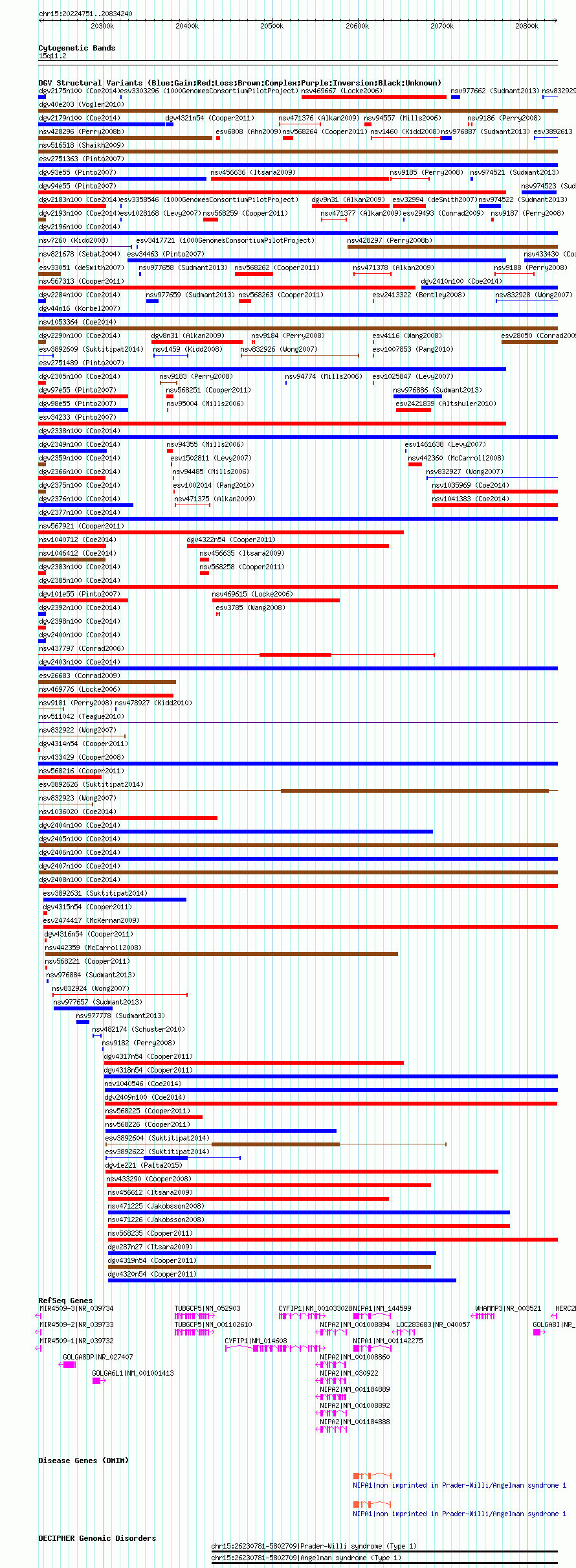 | | Variant Type | CNV gain+loss | | Copy Number | | | Allele State | | | Allele Origin | | | Probe Count | | | Validation Flag | | | Merged Status | M | | Merged Variants | dgv2405n100 | | Supporting Variants | nssv3538819, nssv3538820 | | Samples | | | Known Genes | CYFIP1, GOLGA6L1, GOLGA8DP, GOLGA8I, HERC2P2, LOC283683, MIR4509-1, MIR4509-2, MIR4509-3, NIPA1, NIPA2, TUBGCP5, WHAMMP3 | | Method | SNP array | | Analysis | Affymetrix SNP array copy number analysis | | Platform | Affymetrix SNP Array 6.0 | | Comments | | | Reference | Coe_et_al_2014 | | Pubmed ID | 25217958 | | Accession Number(s) | nsv1040720