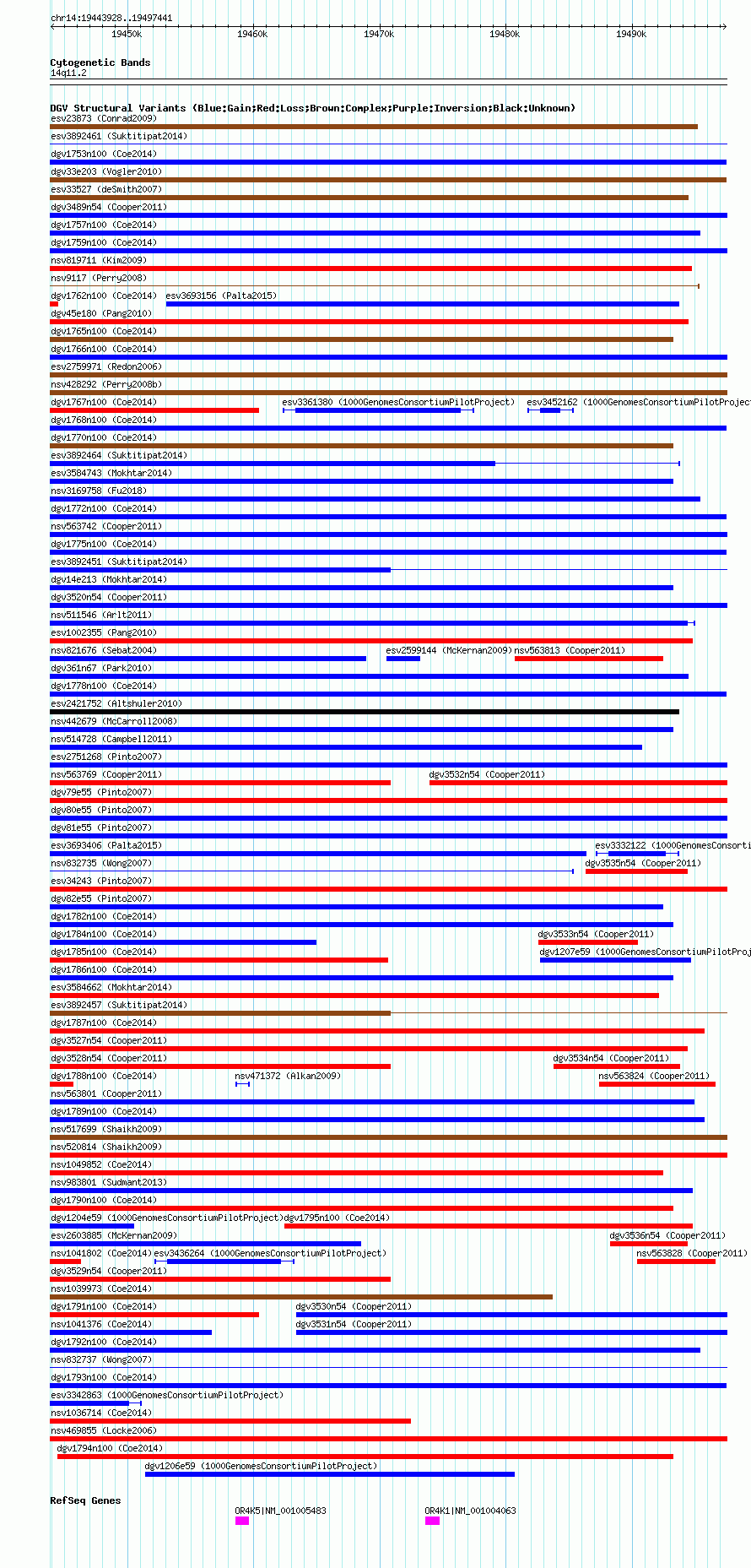 Variant DetailsVariant: nsv1040773| Internal ID | 19129992 | | Landmark | | | Location Information | | | Cytoband | 14q11.2 | | Allele length | | Assembly | Allele length | | hg38 | 53514 | | hg19 | 53514 | | hg18 | 53514 |