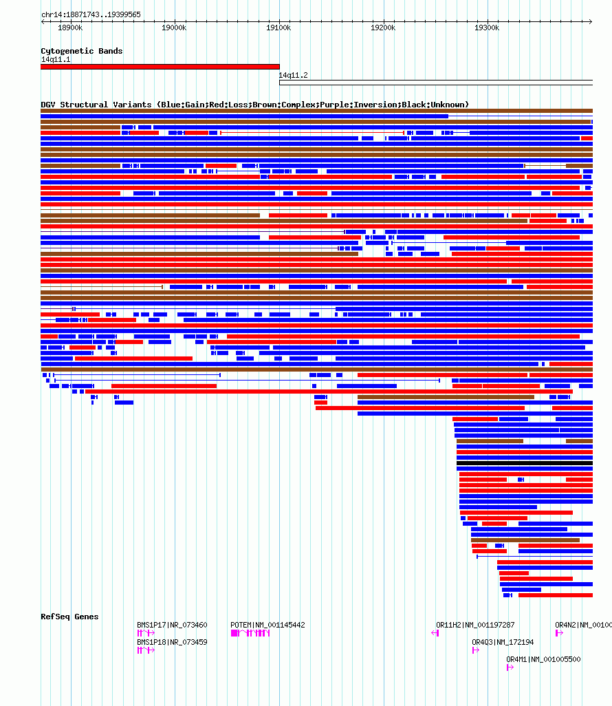 Variant DetailsVariant: nsv1040815| Internal ID | 19130034 | | Landmark | | | Location Information | | | Cytoband | 14q11.1 | | Allele length | | Assembly | Allele length | | hg38 | 630618 | | hg19 | 527983 | | hg18 | 527823 |