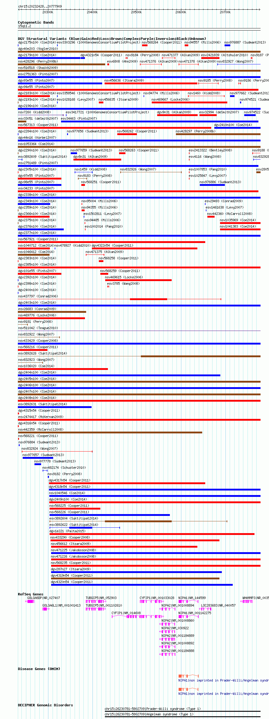 Variant DetailsVariant: nsv1040929| Internal ID | 19130148 | | Landmark | | | Location Information | | | Cytoband | 15q11.2 | | Allele length | | Assembly | Allele length | | hg38 | 545377 | | hg19 | 545405 | | hg18 | 545482 |