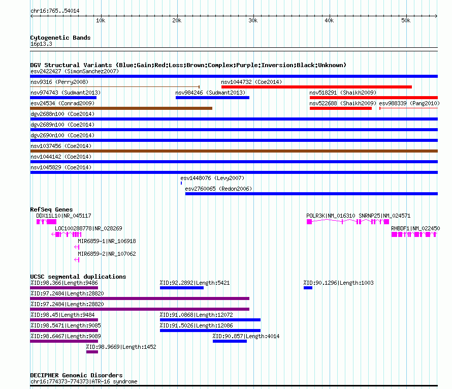 |  | Variant Type | CNV gain |  | Copy Number |  |  | Allele State |  |  | Allele Origin |  |  | Probe Count |  |  | Validation Flag |  |  | Merged Status | M |  | Merged Variants | dgv2688n100 |  | Supporting Variants | nssv3556927 |  | Samples |  |  | Known Genes | DDX11L10, LOC100288778, MIR6859-1, MIR6859-2, POLR3K, RHBDF1, SNRNP25 |  | Method | SNP array |  | Analysis | Affymetrix SNP array copy number analysis |  | Platform | Affymetrix SNP Array 6.0 |  | Comments |  |  | Reference | Coe_et_al_2014 |  | Pubmed ID | 25217958 |  | Accession Number(s) | nsv1041006