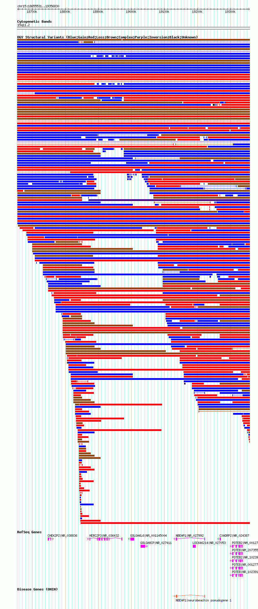 Variant DetailsVariant: nsv1041020| Internal ID | 19130239 | | Landmark | | | Location Information | | | Cytoband | 15q11.1 | | Allele length | | Assembly | Allele length | | hg38 | 696579 | | hg19 | 696655 | | hg18 | 701300 |