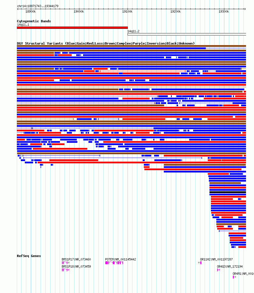 Variant DetailsVariant: nsv1041089| Internal ID | 19130308 | | Landmark | | | Location Information | | | Cytoband | 14q11.1 | | Allele length | | Assembly | Allele length | | hg38 | 575232 | | hg19 | 472597 | | hg18 | 472437 |