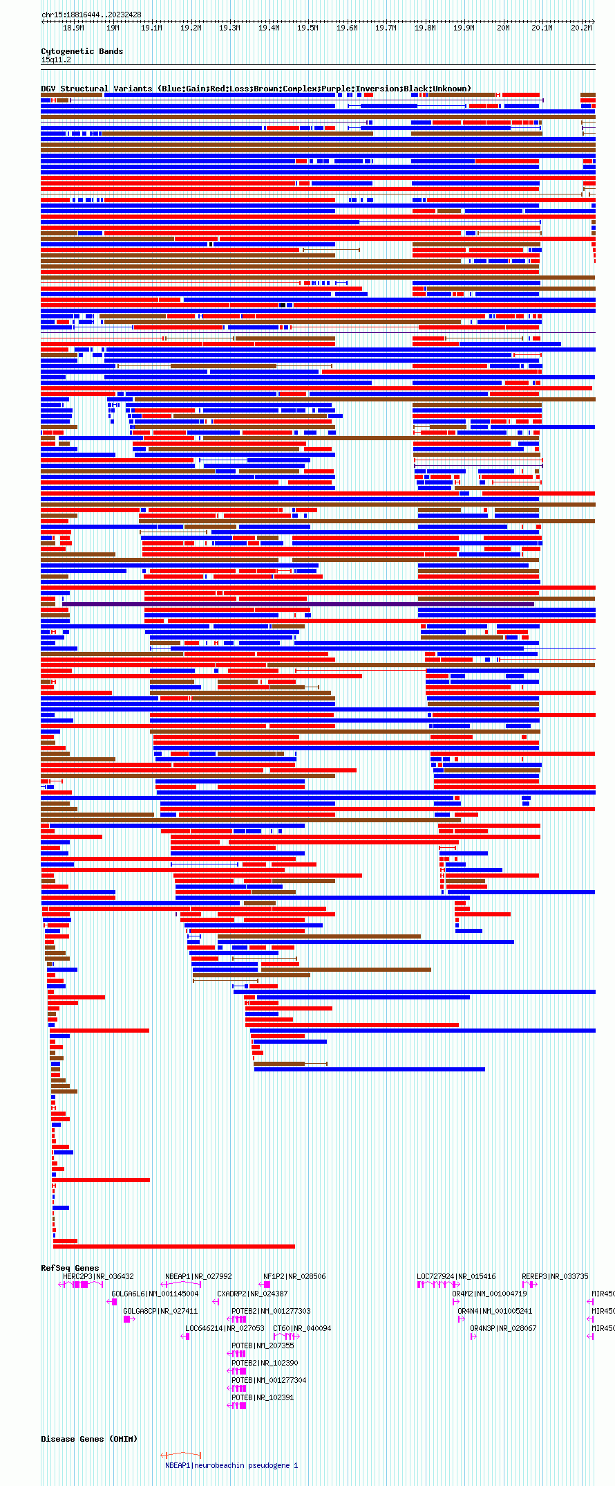 Variant DetailsVariant: nsv1041241| Internal ID | 19130460 | | Landmark | | | Location Information | | | Cytoband | 15q11.1 | | Allele length | | Assembly | Allele length | | hg38 | 1957066 | | hg19 | 2124635 | | hg18 | 1415985 |