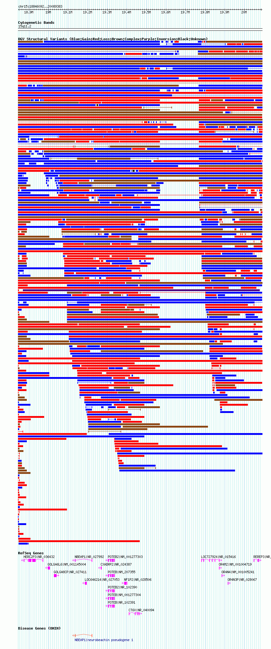 Variant DetailsVariant: nsv1041396| Internal ID | 19130615 | | Landmark | | | Location Information | | | Cytoband | 15q11.1 | | Allele length | | Assembly | Allele length | | hg38 | 1919244 | | hg19 | 2001942 | | hg18 | 1243292 |
