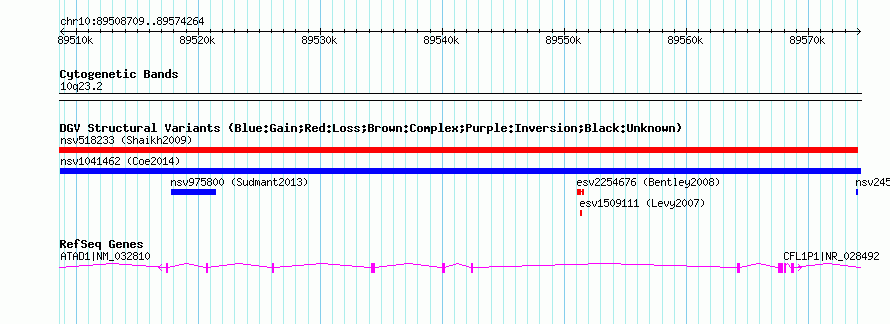 Variant DetailsVariant: nsv1041462| Internal ID | 19130681 | | Landmark | | | Location Information | | | Cytoband | 10q23.2 | | Allele length | | Assembly | Allele length | | hg38 | 65556 | | hg19 | 65556 | | hg18 | 65556 |