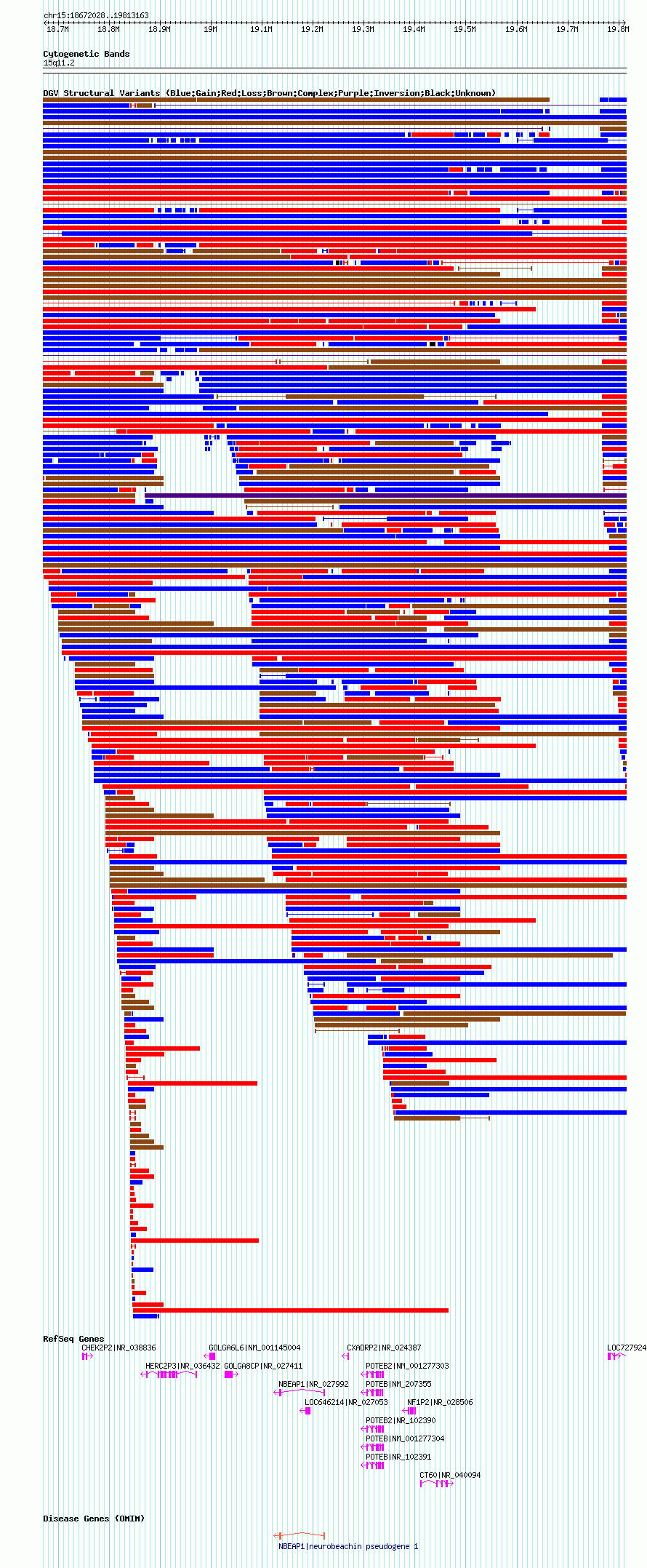 Variant DetailsVariant: nsv1041499| Internal ID | 19130718 | | Landmark | | | Location Information | | | Cytoband | 15q11.1 | | Allele length | | Assembly | Allele length | | hg38 | 1817088 | | hg19 | 1899786 | | hg18 | 1141136 |