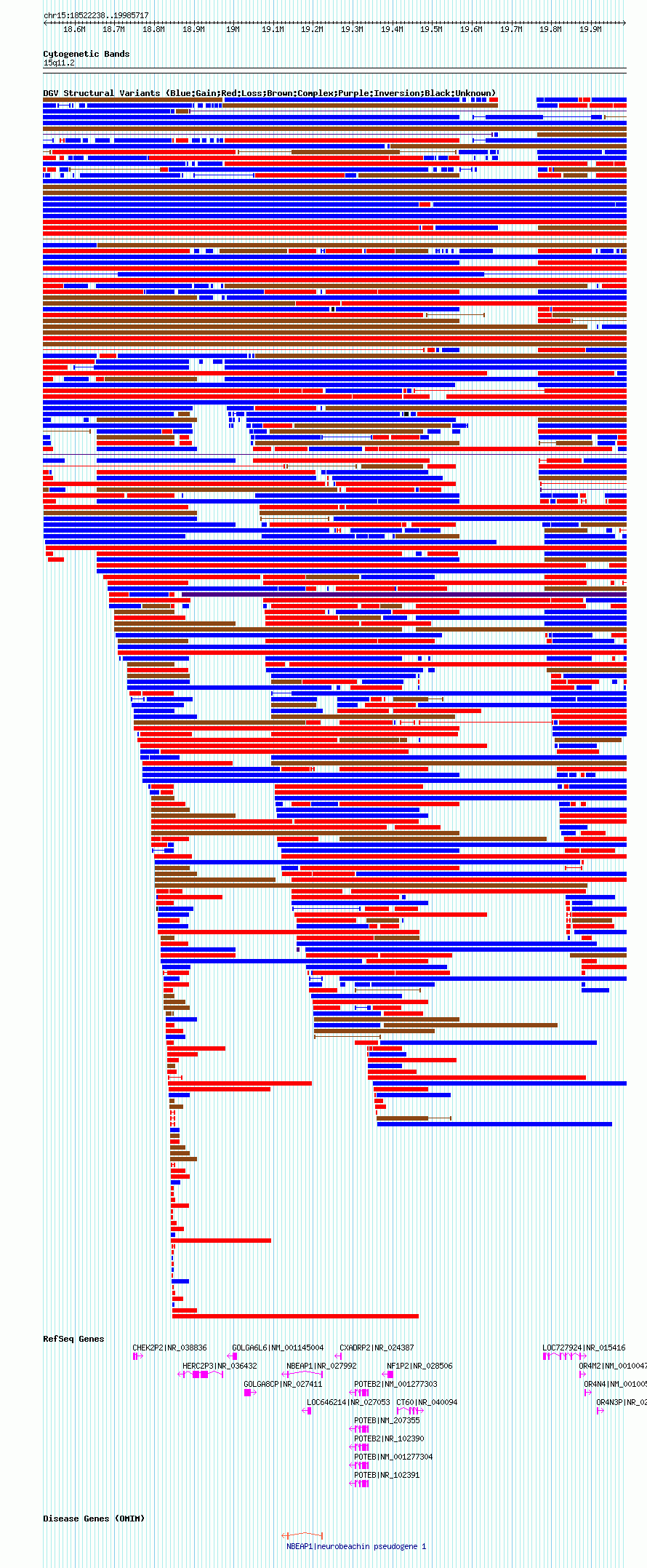 Variant DetailsVariant: nsv1041522| Internal ID | 19130741 | | Landmark | | | Location Information | | | Cytoband | 15q11.1 | | Allele length | | Assembly | Allele length | | hg38 | 2139432 | | hg19 | 2222130 | | hg18 | 1463480 |
