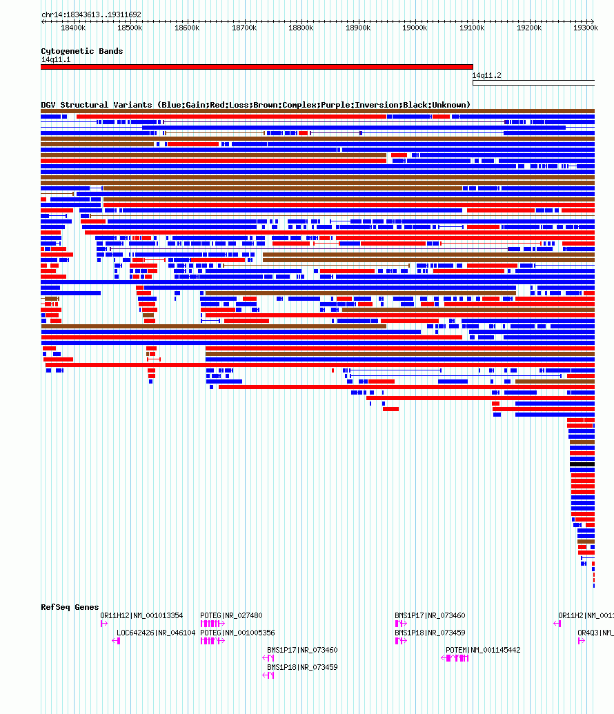 Variant DetailsVariant: nsv1041547| Internal ID | 19130766 | | Landmark | | | Location Information | | | Cytoband | 14q11.1 | | Allele length | | Assembly | Allele length | | hg38 | 1276558 | | hg19 | 968240 | | hg18 | 968080 |