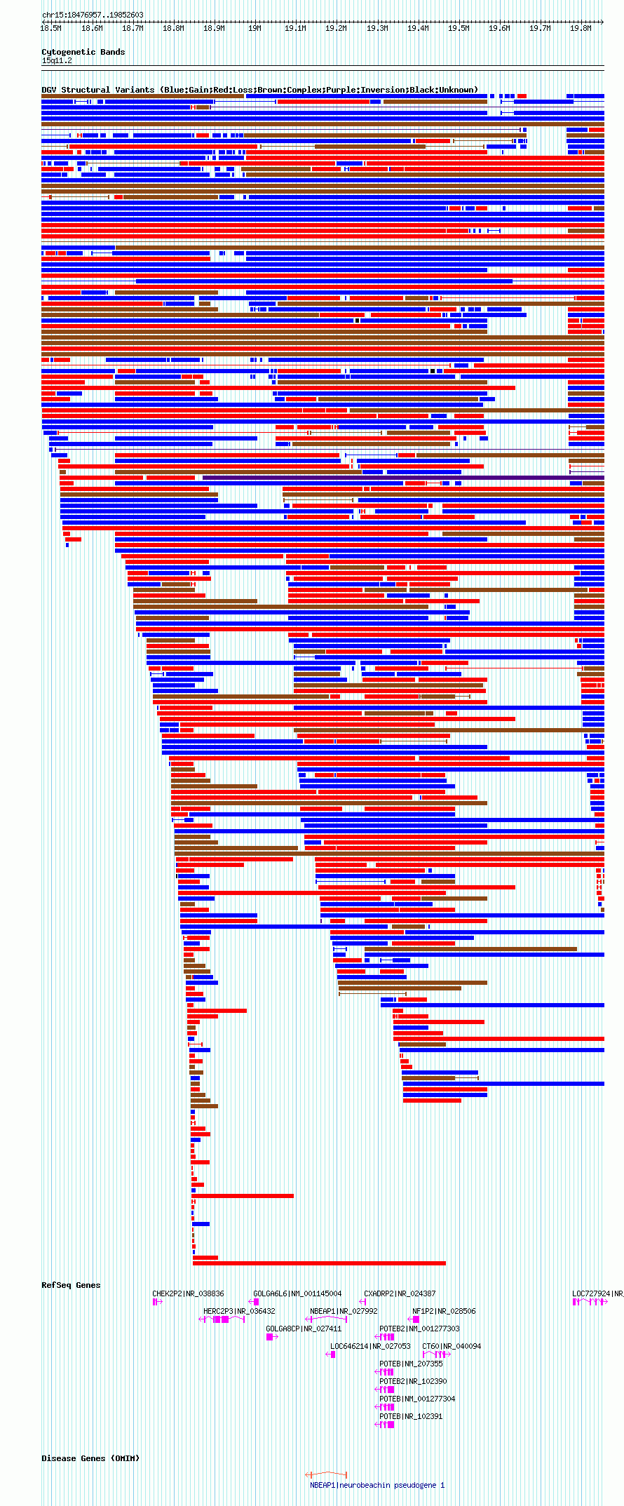 Variant DetailsVariant: nsv1041570| Internal ID | 19130789 | | Landmark | | | Location Information | | | Cytoband | 15q11.1 | | Allele length | | Assembly | Allele length | | hg38 | 2051599 | | hg19 | 2134297 | | hg18 | 1375647 |
