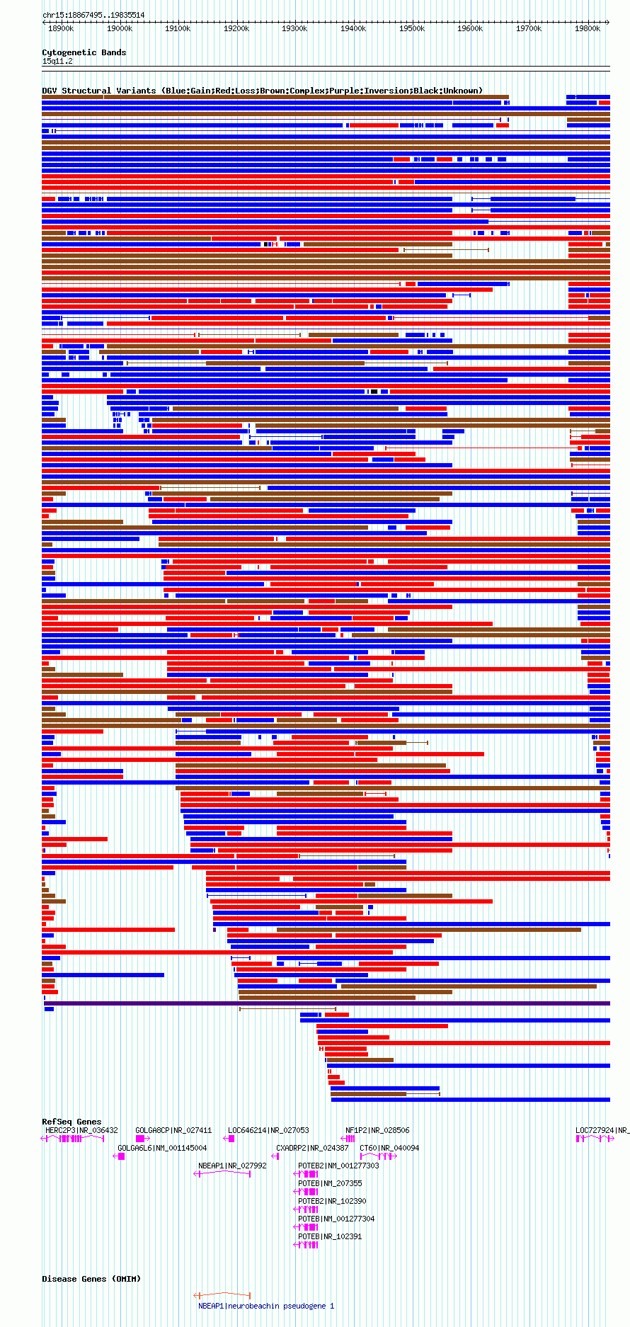 Variant DetailsVariant: nsv1041590| Internal ID | 19130809 | | Landmark | | | Location Information | | | Cytoband | 15q11.1 | | Allele length | | Assembly | Allele length | | hg38 | 1643972 | | hg19 | 1726670 | | hg18 | 968020 |