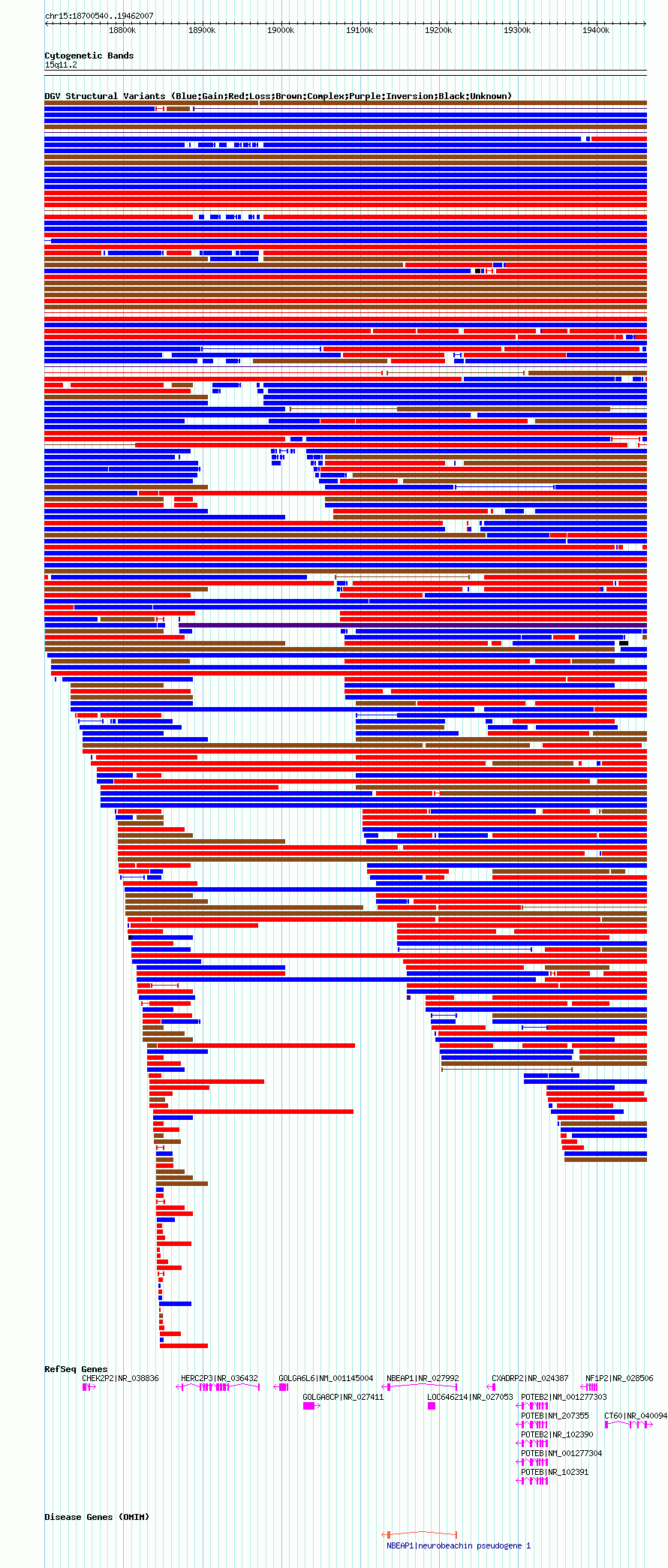Variant DetailsVariant: nsv1041672| Internal ID | 19130891 | | Landmark | | | Location Information | | | Cytoband | 15q11.1 | | Allele length | | Assembly | Allele length | | hg38 | 756747 | | hg19 | 756823 | | hg18 | 761468 |