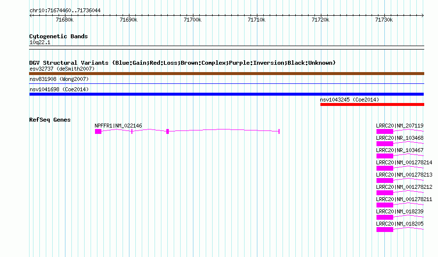 | Variant Type | CNV gain | Copy Number | | Allele State | | Allele Origin | | Probe Count | | Validation Flag | | Merged Status | M | Merged Variants | | Supporting Variants | nssv3513337 | Samples | | Known Genes | LRRC20, NPFFR1 | Method | SNP array | Analysis | Affymetrix SNP array copy number analysis | Platform | Affymetrix SNP Array 6.0 | Comments | | Reference | Coe_et_al_2014 | Pubmed ID | 25217958 | Accession Number(s) | nsv1041698
