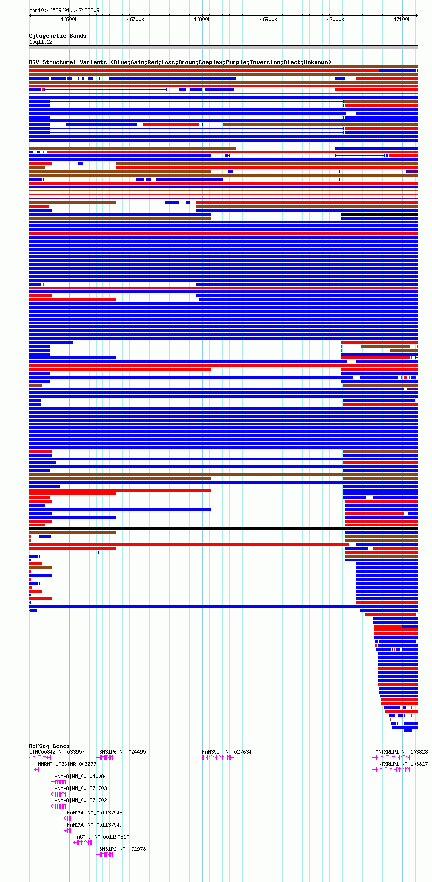 Variant DetailsVariant: nsv1041773| Internal ID | 19130992 | | Landmark | | | Location Information | | | Cytoband | 10q11.22 | | Allele length | | Assembly | Allele length | | hg18 | 583119 |
