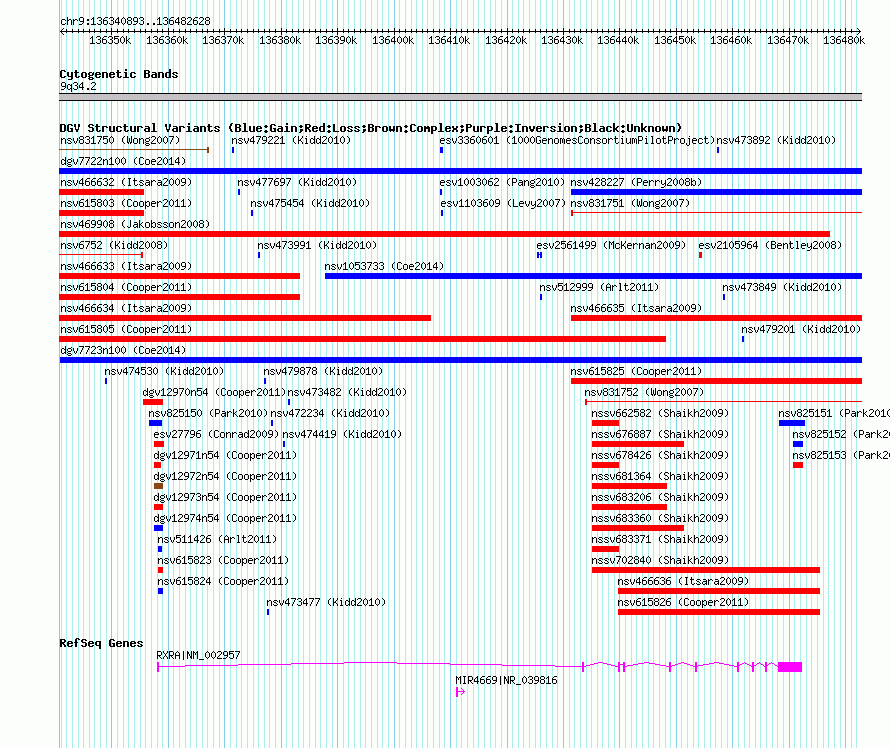 Variant DetailsVariant: nsv1042127| Internal ID | 18784658 | | Landmark | | | Location Information | | | Cytoband | 9q34.2 | | Allele length | | Assembly | Allele length | | hg38 | 141736 | | hg19 | 141736 | | hg18 | 141736 |
