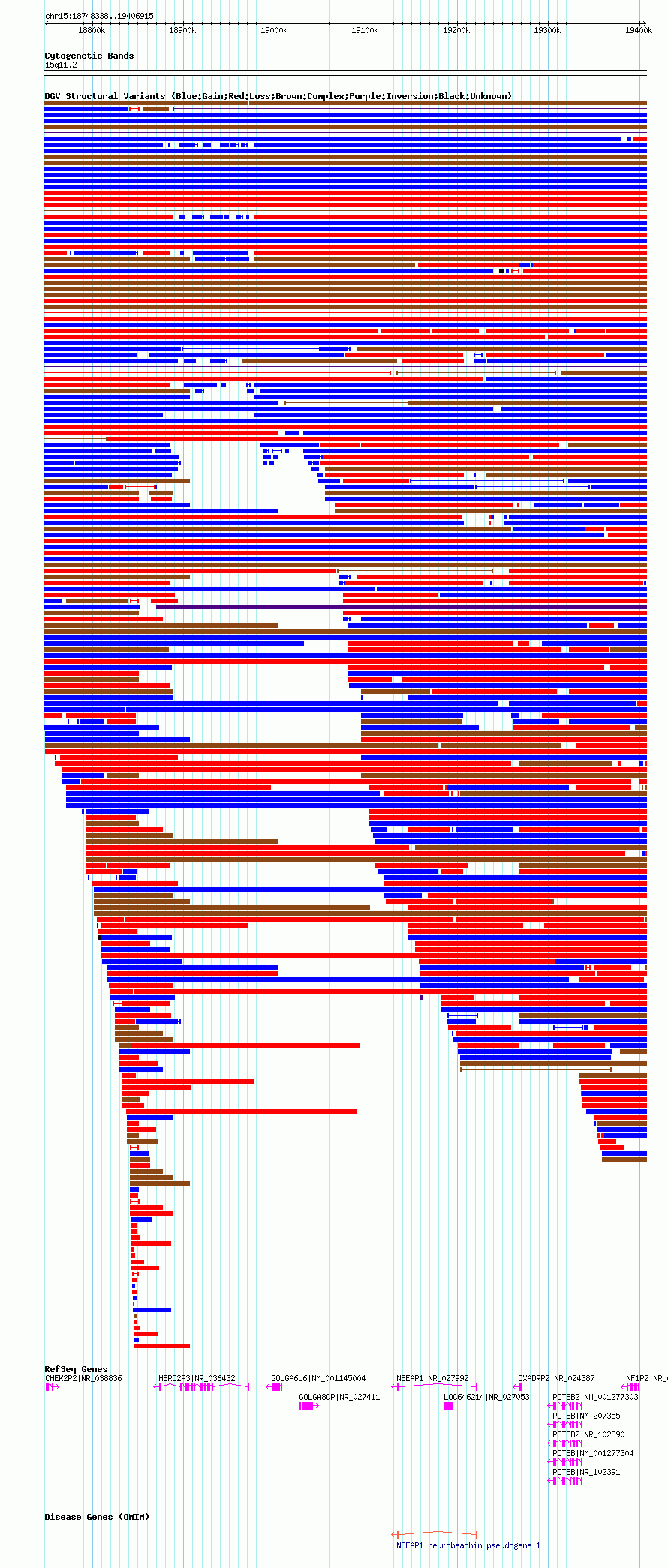 | | Variant Type | CNV gain | | Copy Number | | | Allele State | | | Allele Origin | | | Probe Count | | | Validation Flag | | | Merged Status | M | | Merged Variants | dgv2212n100 | | Supporting Variants | nssv3536037 | | Samples | | | Known Genes | CHEK2P2, CXADRP2, GOLGA6L6, GOLGA8CP, HERC2P3, LOC646214, NBEAP1, NF1P2, POTEB, POTEB2 | | Method | SNP array | | Analysis | Affymetrix SNP array copy number analysis | | Platform | Affymetrix SNP Array 6.0 | | Comments | | | Reference | Coe_et_al_2014 | | Pubmed ID | 25217958 | | Accession Number(s) | nsv1042157
