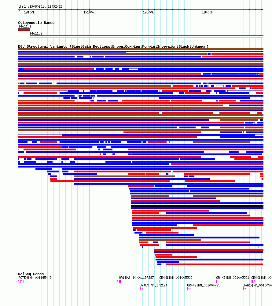 Variant DetailsVariant: nsv1042228| Internal ID | 19131447 | | Landmark | | | Location Information | | | Cytoband | 14q11.1 | | Allele length | | Assembly | Allele length | | hg38 | 529465 | | hg19 | 411683 | | hg18 | 411523 |