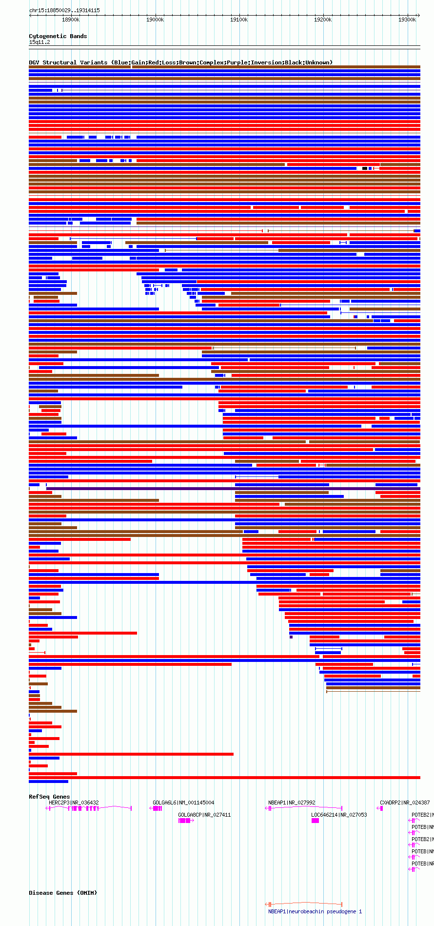 | | Variant Type | CNV gain | | Copy Number | | | Allele State | | | Allele Origin | | | Probe Count | | | Validation Flag | | | Merged Status | M | | Merged Variants | dgv2257n100 | | Supporting Variants | nssv3539563 | | Samples | | | Known Genes | CXADRP2, GOLGA6L6, GOLGA8CP, HERC2P3, LOC646214, NBEAP1, POTEB, POTEB2 | | Method | SNP array | | Analysis | Affymetrix SNP array copy number analysis | | Platform | Affymetrix SNP Array 6.0 | | Comments | | | Reference | Coe_et_al_2014 | | Pubmed ID | 25217958 | | Accession Number(s) | nsv1042346