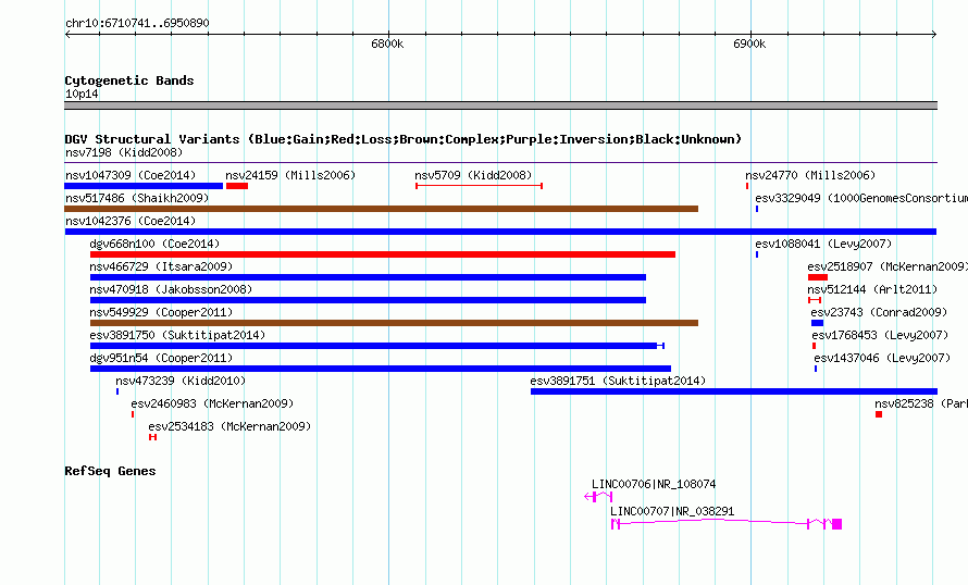 Variant DetailsVariant: nsv1042376| Internal ID | 19131595 | | Landmark | | | Location Information | | | Cytoband | 10p14 | | Allele length | | Assembly | Allele length | | hg38 | 240150 | | hg19 | 240150 | | hg18 | 240150 |