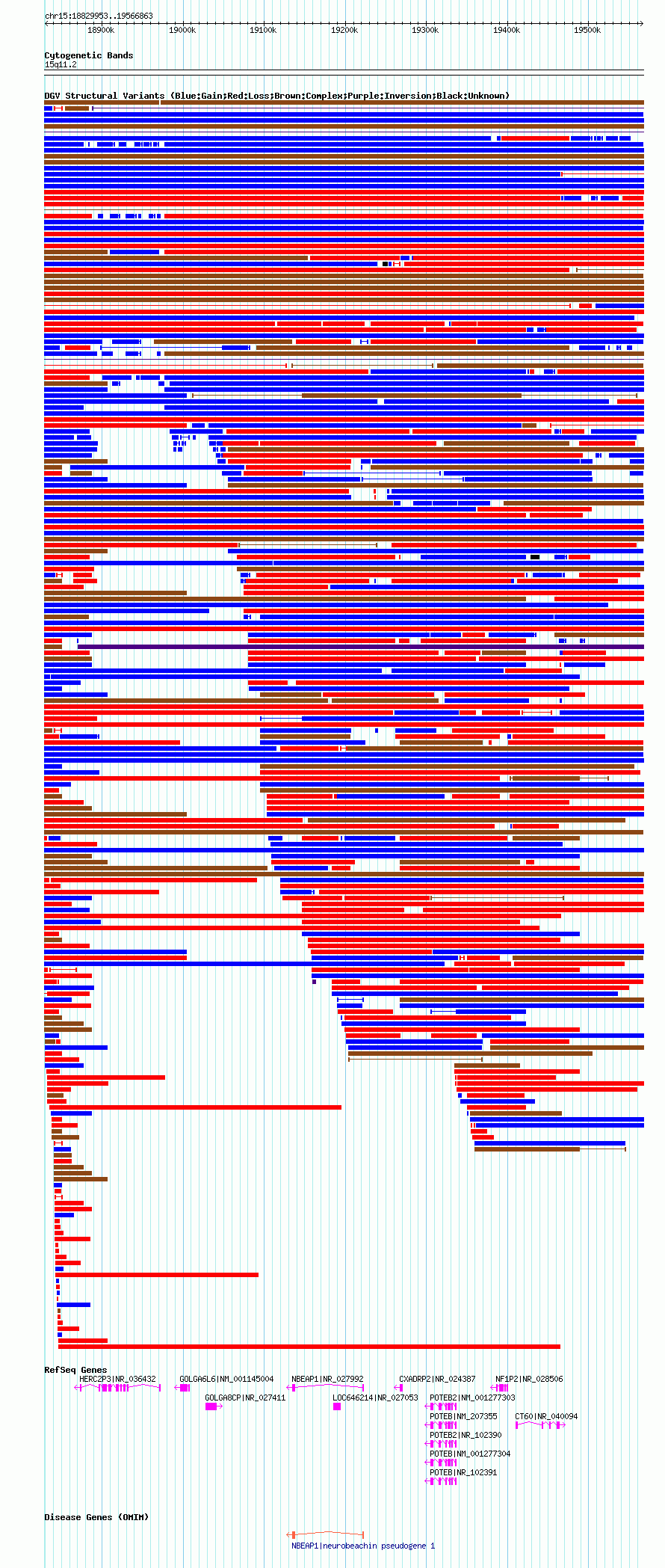 Variant DetailsVariant: nsv1042510| Internal ID | 19131729 | | Landmark | | | Location Information | | | Cytoband | 15q11.1 | | Allele length | | Assembly | Allele length | | hg38 | 732190 | | hg19 | 732266 | | hg18 | 736911 |