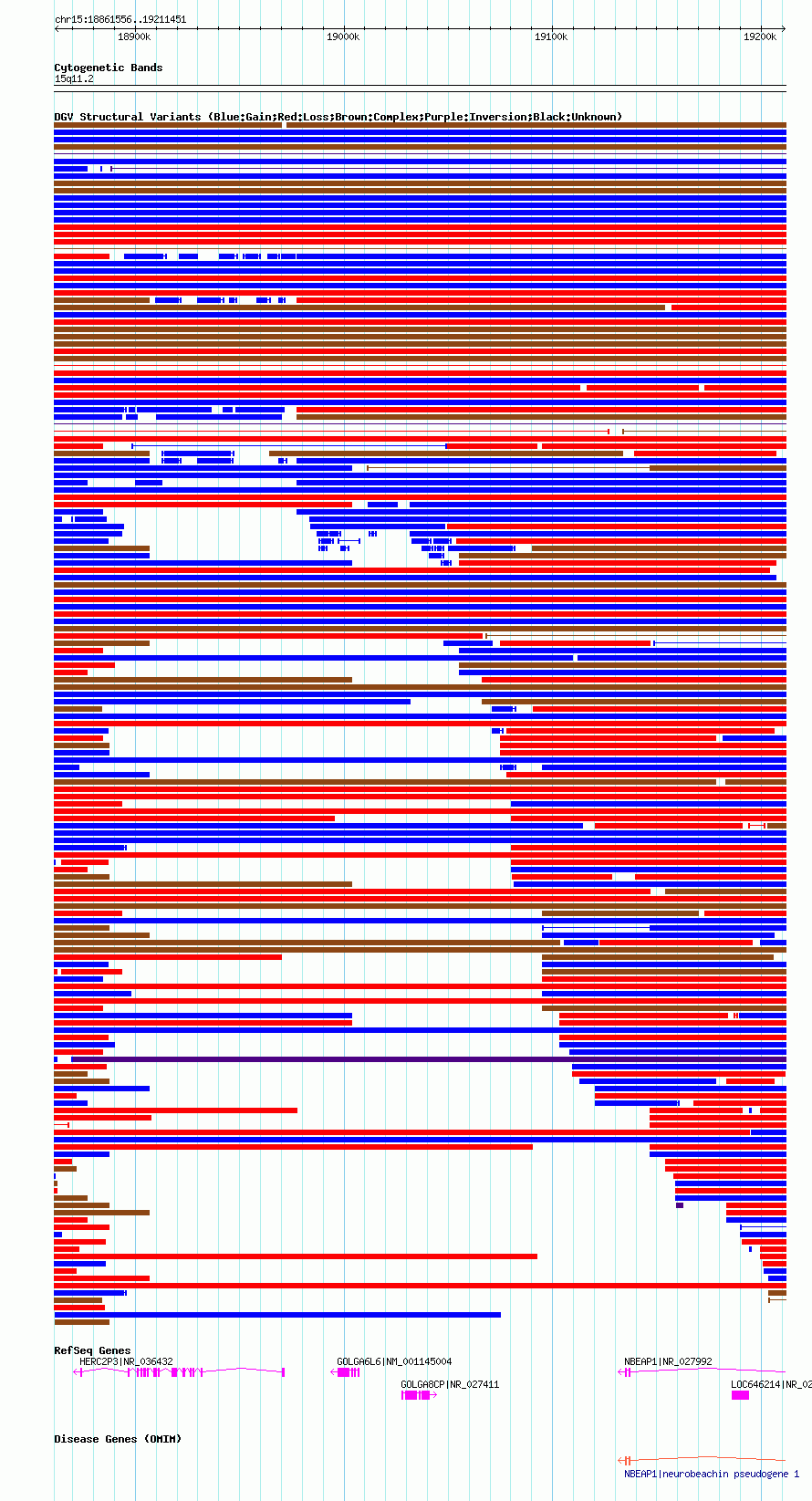 | | Variant Type | CNV gain | | Copy Number | | | Allele State | | | Allele Origin | | | Probe Count | | | Validation Flag | | | Merged Status | M | | Merged Variants | dgv2257n100 | | Supporting Variants | nssv3539662 | | Samples | | | Known Genes | GOLGA6L6, GOLGA8CP, HERC2P3, LOC646214, NBEAP1 | | Method | SNP array | | Analysis | Affymetrix SNP array copy number analysis | | Platform | Affymetrix SNP Array 6.0 | | Comments | | | Reference | Coe_et_al_2014 | | Pubmed ID | 25217958 | | Accession Number(s) | nsv1042528