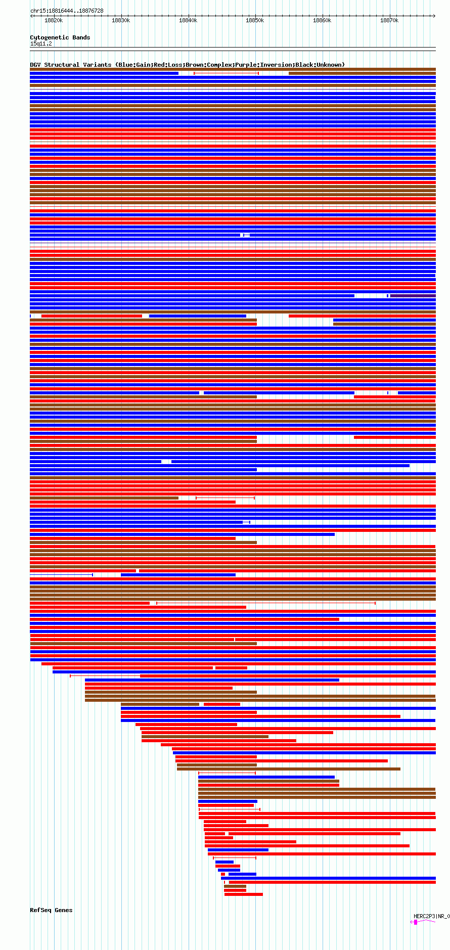 Variant DetailsVariant: nsv1042565| Internal ID | 19131784 | | Landmark | | | Location Information | | | Cytoband | 15q11.1 | | Allele length | | Assembly | Allele length | | hg38 | 60285 | | hg19 | 60285 | | hg18 | 60285 |
