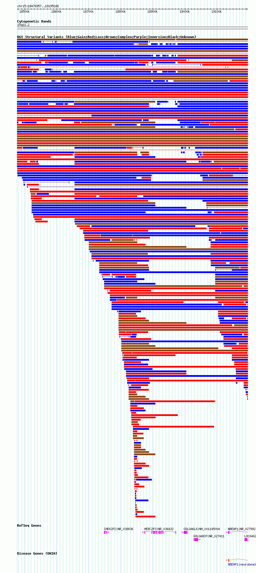 Variant DetailsVariant: nsv1042582| Internal ID | 19131801 | | Landmark | | | Location Information | | | Cytoband | 15q11.1 | | Allele length | | Assembly | Allele length | | hg38 | 718161 | | hg19 | 718237 | | hg18 | 718230 |