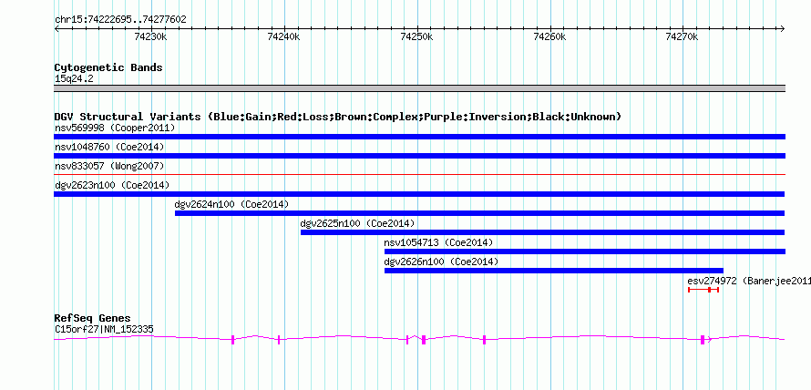 Variant DetailsVariant: nsv1042750| Internal ID | 19131969 | | Landmark | | | Location Information | | | Cytoband | 15q24.2 | | Allele length | | Assembly | Allele length | | hg38 | 54908 | | hg19 | 54908 | | hg18 | 54908 |
